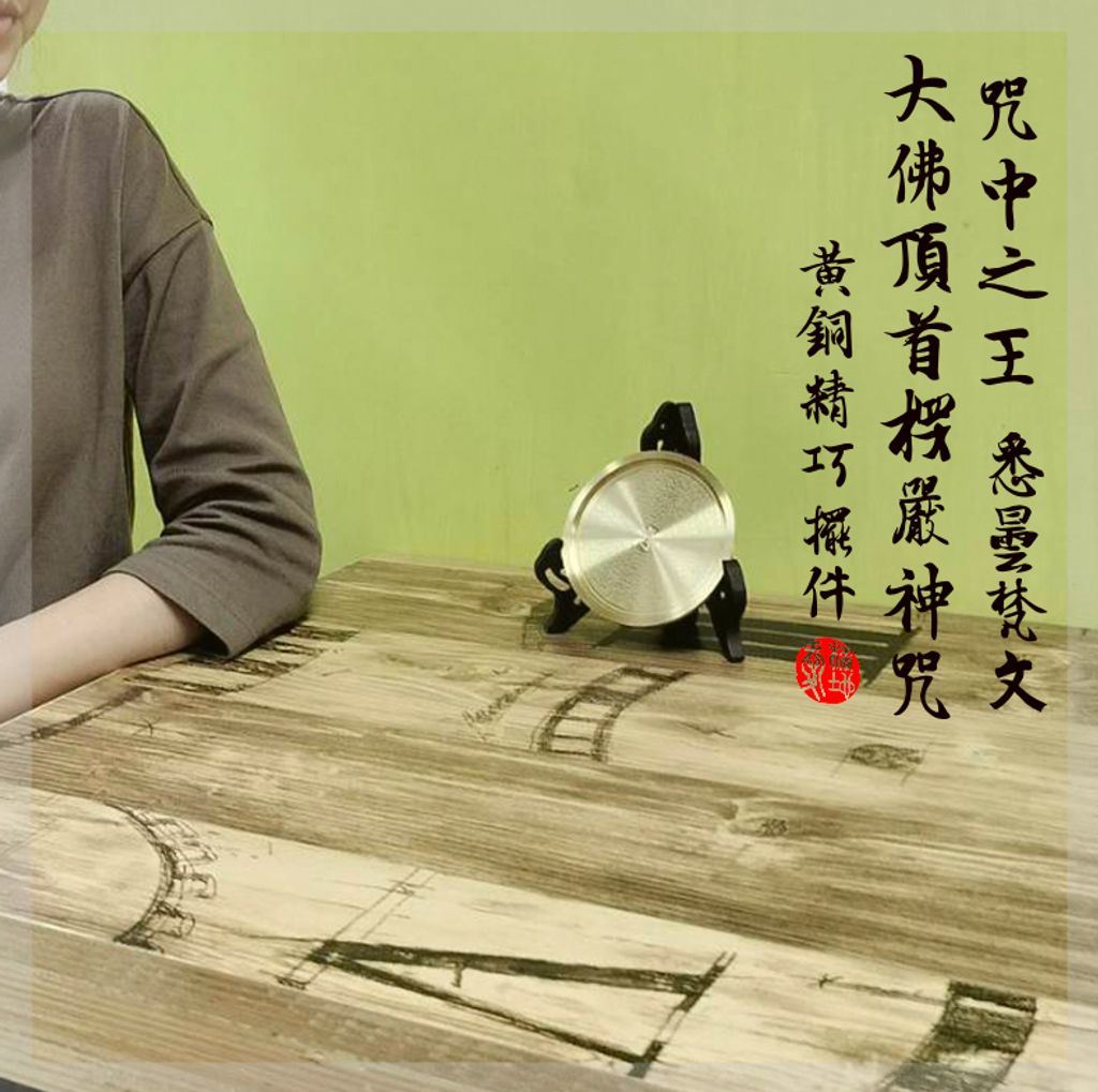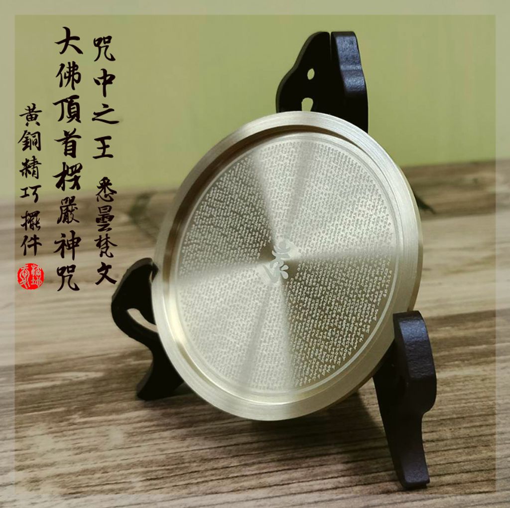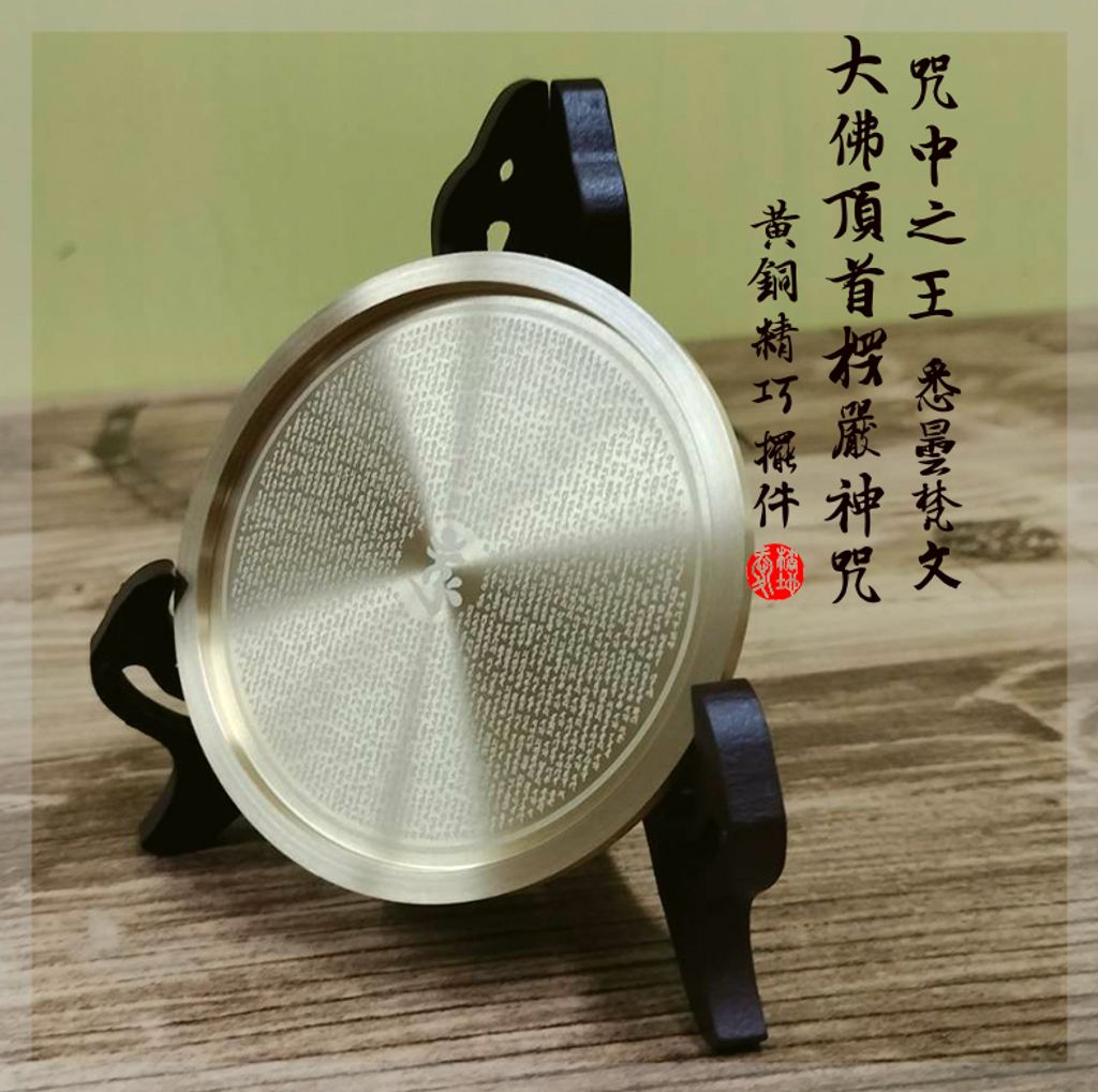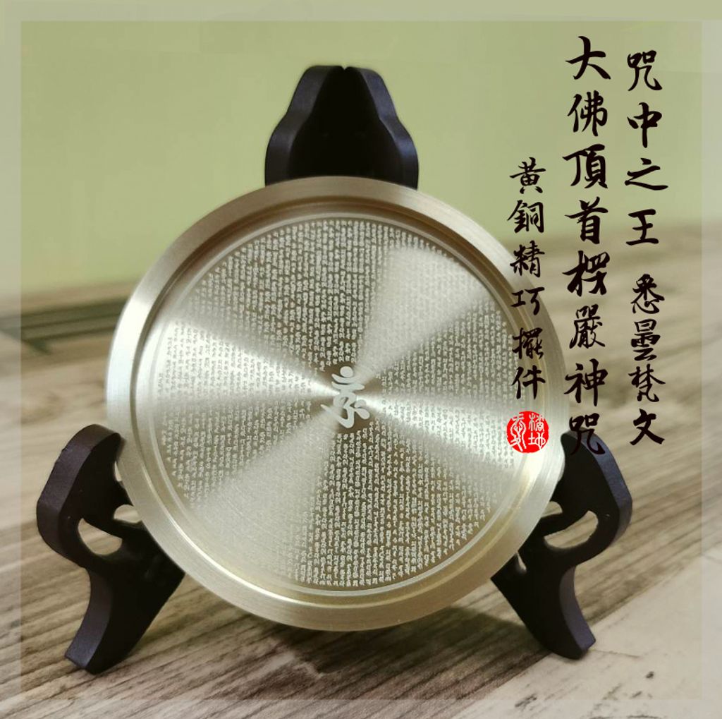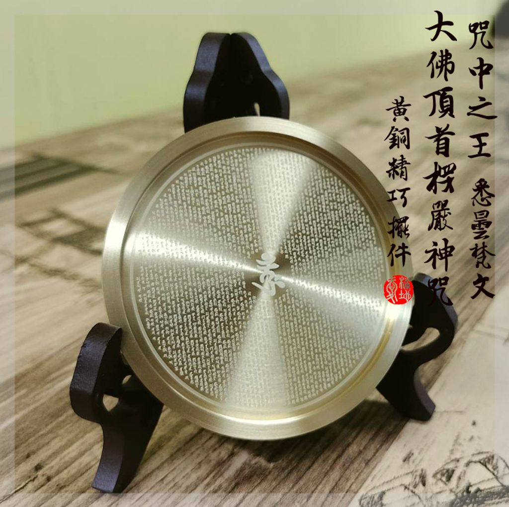 該擺件目前開發悉曇梵文,中間圍繞著楞嚴咒種子字,以黃銅材質製作,雕刻設計產地為台灣宜蘭。它的尺寸為100mm直徑,並附有一個木架,表面髮絲效果,其特點考量銅在時間長遠會有氧化情況,除了密封液的處理外,雕刻文字以亮金黃文字效果,由於此處多重燒雕製成可以有效隔絕空間避免氧化,越長效果越佳,呈現出對比效果會越明顯。